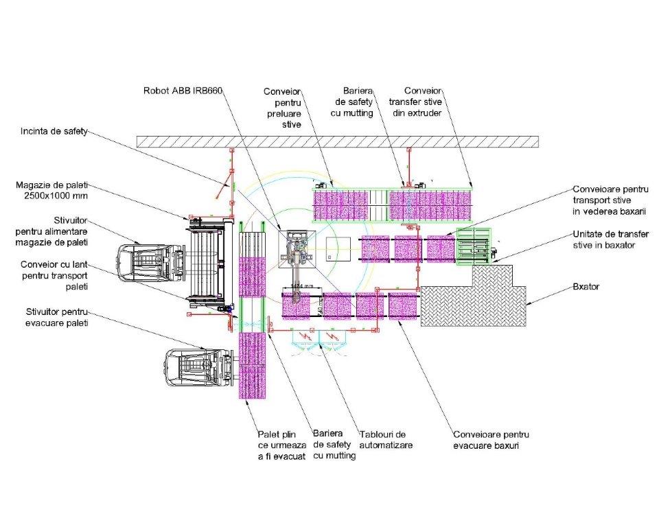Soluţia propusă companiei Austrotherm de Mach FTD a constat în instalarea și punerea în funcţiune a unui robot de paletizare ABB IRB 660 pentru preluarea plăcilor de polistiren în vederea ambalării primare de către baxator, cât și paletizarea pachetelor de polistiren rezultate după ambalarea primară.