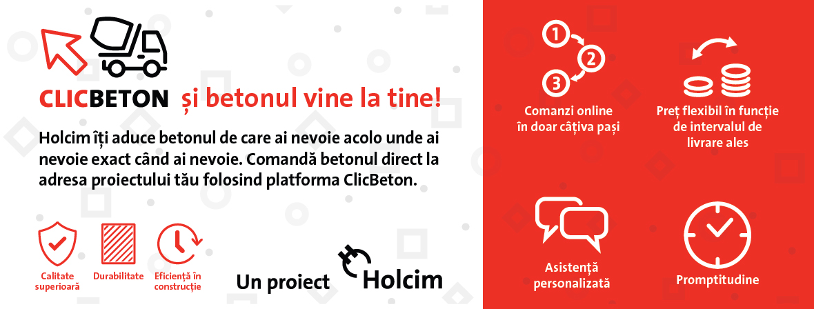 Producătorul de materiale de construcţii a lansat în luna aprilie a acestui an ClicBeton, prima platformă online din România care asigură livrarea betonului în şantier, la timp şi în condiţii de siguranţă, reprezentând o nouă experienţă de cumpărare pentru clienţi. Platforma se adresează persoanelor fizice şi companiilor de dimensiuni reduse, cărora le oferă posibilitatea de a plasa comanda oricând şi de oriunde, contribuind şi la reducerea timpului alocat achiziţiei betonului.