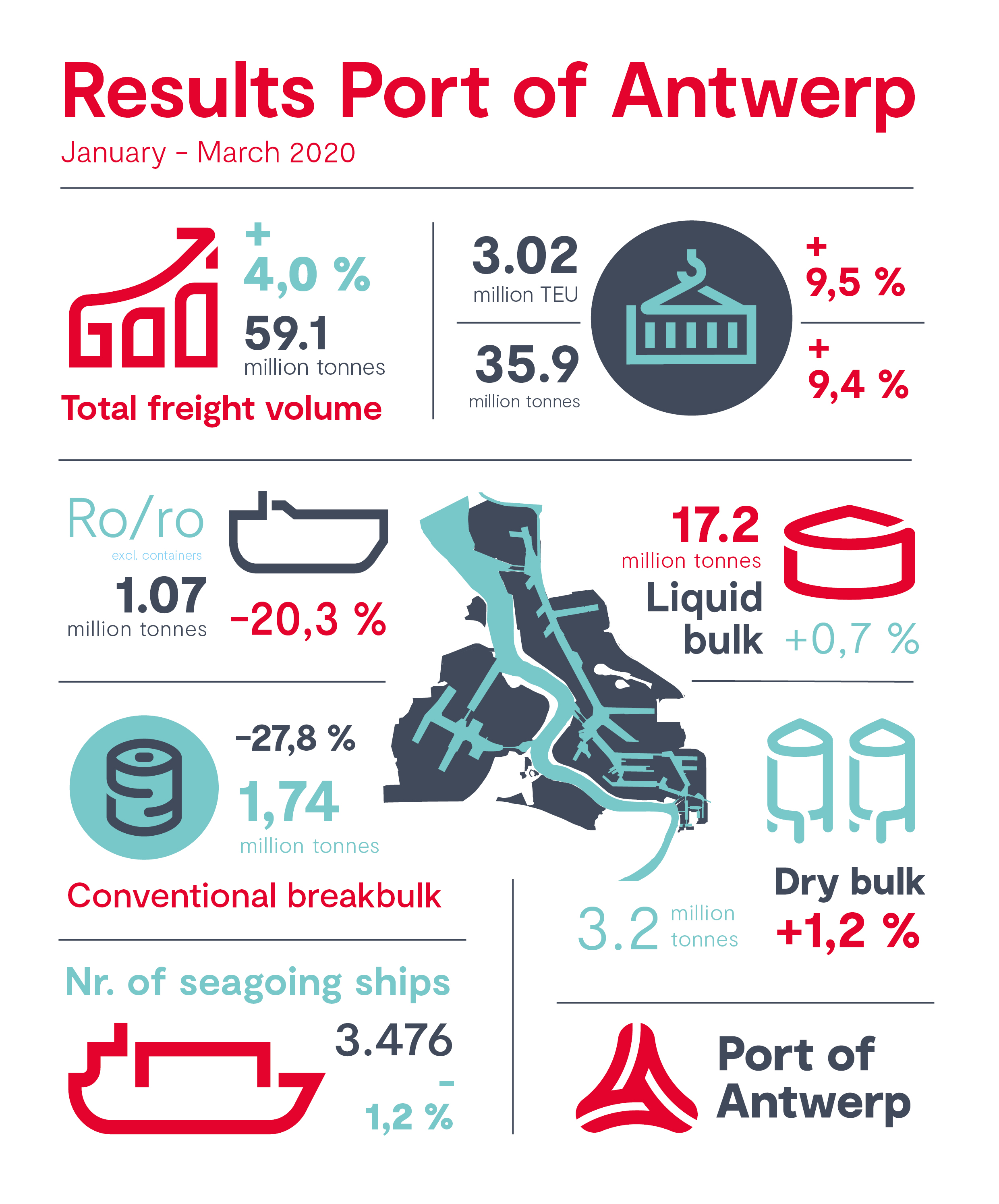 Volumul total de marfă manipulat în Portul Antwerp din Belgia în primul trimestru din 2020 a crescut cu 4% comparativ cu aceeași perioadă a anului trecut. Creșterea pe segmentul de marfă containerizată a contribuit la acest rezultat pozitiv și a compensate pentru declinul înregistrat pe celelalte segmente.
