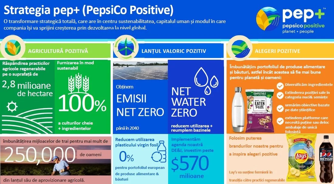 Daniel Drăguşin: Este vorba despre trei piloni cheie: agricultura pozitivă, lanţul valoric pozitiv și alegeri pozitive. Agricultura pozitivă pune accent pe răspândirea practicilor regenerabile, cu scopul regenerării solului pe toată amprenta agricolă a companiei, aproximativ 2,8 milioane hectare. În același timp, prin susţinerea unui lanţ valoric pozitiv, PepsiCo va contribui la construirea unui lanţ valoric circular prin diverse acţiuni pentru a ajunge la zero emisii de gaze cu efect de seră până în 2040, la utilizarea apei în mod pozitiv până în 2030, dar și la introducerea unor ambalaje mai sustenabile în lanţul valoric. Prin alegeri pozitive, o a treia direcţie importantă a strategiei, continuăm să dezvoltăm portofoliul de produse alimentare și băuturi, folosind totodată amploarea și popularitatea mărcilor noastre globale pentru a genera un impact pozitiv la scară largă.