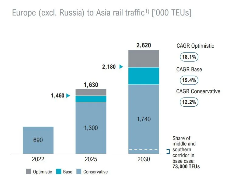 Perspectivele se păstrează optimiste odată de războiul din Ucrina va înceta. Astfel, estimările pentru o creştere a transportul feroviar eurasiatic sunt puternice, însă depinde şi de nivelul ratelor maritime, dar şi de volumele de comerţ între China şi Europa. În prezent, calea ferată are doar o cotă de ~2% din traficul containerizat, experți se așteaptă ca această cotă să crească treptat, urmând a se stabiliza la 4-6%.