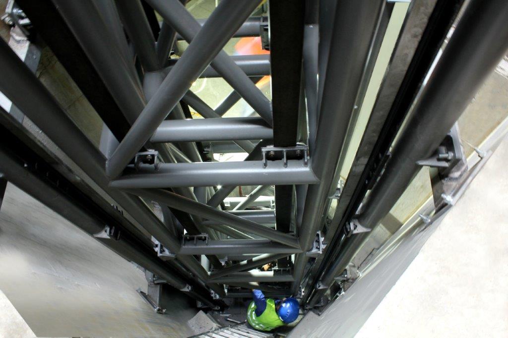 Pentru sistemul de acționare, echipa de proiectanți Elmas a conceput o soluție tehnică specială, având în componență un piston hidraulic poziționat central și o structură metalică telescopică, alcătuită din două segmente. Toate aceste elemente sunt montate în interiorul puțului platformei. Puțul platformei este format din doua sectoare: sectorul realizat din beton armat și sectorul format din interiorul ansamblului arhitectural din sticlă. La momentul activării comenzii platformei pentru persoane, pistonul hidraulic acționează segmentul interior al structurii metalice. După extinderea segmentului interior, cursa platformei continuă, prin preluarea segmentului metalic exterior, până la atingerea stației finale. Pentru a crea un efect emoțional și vizual, la atingerea punctului maxim al cursei, cabina platformei se va afla complet în interiorul ansamblului arhitectural din sticlă.