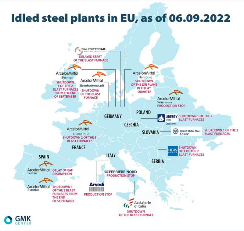 Fabricile de oțel sunt afectate de cererea slabă și de creșterea costurilor cu energia electrică, precum și de importurile din alte zone, care sunt produse cu costuri ebergetice mai mici. În acest context, tot mai mulți producători au suspendat sau intenționează să suspende producția de oțel în Europa. Potrivit datelor GMK Center, la finalul lunii iulie, 9 unități de producție din Europa anunțaseră oprirea totală sau parțială a producției. Începând cu 6 septembrie 2022, 15 fabrici din Uniunea Europeană se aflau în această situație.