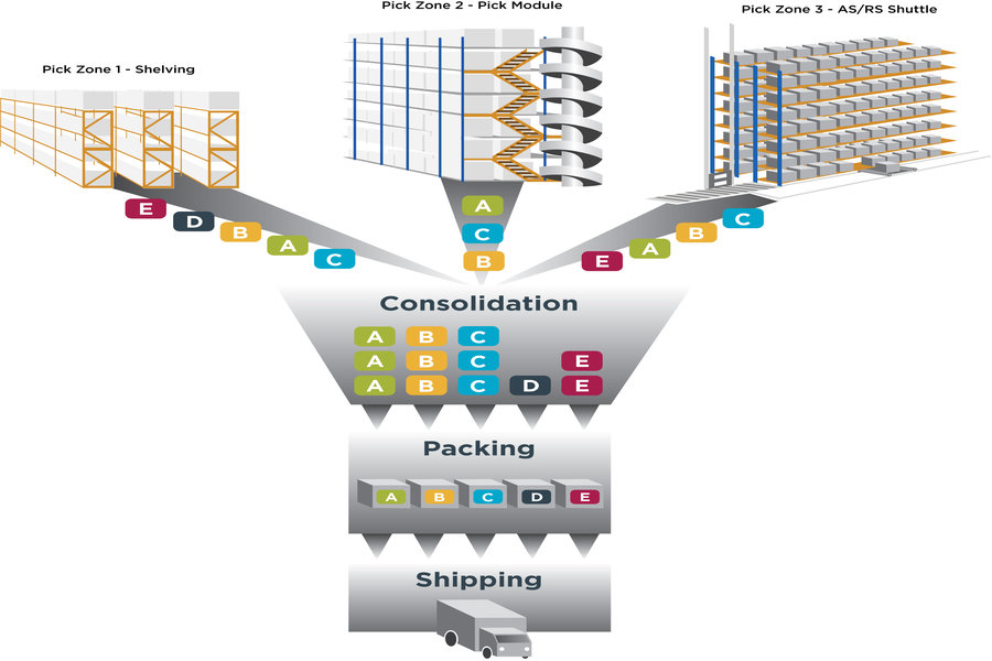 Aceasta este o alternativă la metoda de colectare pick&pass. Fiecare zonă selectează articolele solicitate pentru comandă simultan. Când comanda parţială dintr-o zonă este completă, aceasta este trimisă la consolidare până când toate articolele din celelalte zone ajung în zona de colectare. Comenzile parţiale sunt puse împreună într-o singură comandă, care este mai apoi trimisă la expediţii. Aceasta este o strategie avansată care necesită instalarea unui sistem pentru managementul stocurilor (IMS – inventory management software).
