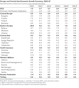 Se estimează că PIB-ul regional va crește cu 2,4% în termeni reali în acest an, în scădere față de 3,7% în 2024, în principal din cauza unui ritm mai lent de expansiune în Federația Rusă. Excluzând Rusia, care reprezintă aproximativ 40% din producția regiunii, creșterea este probabil să rămână aproape neschimbată, la aproximativ 3,3% în acest an și anul viitor.