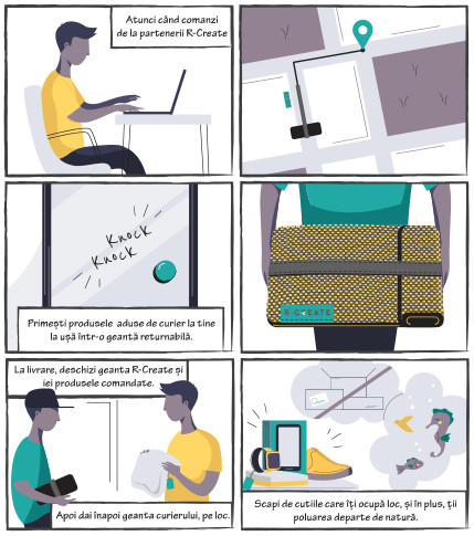 R-CREATE este un ambalaj returnabil ușor de accesat și folosit pentru a livra comenzile online acasă fără a crea deșeuri suplimentare.