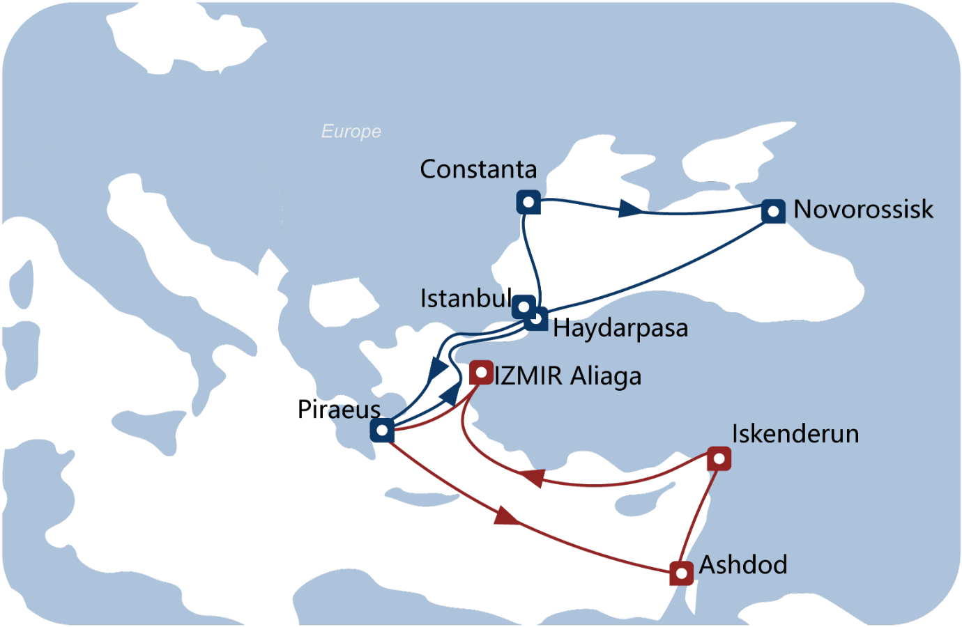 Timpul de tranzit din Constanţa către Ashdod este de 10 zile (9 zile din Ashdod către Constanţa), acesta fiind un serviciu direct, iar până în Haifa este de 12 zile via Portul Pireu (15 zile pe ruta de întoarcere din Haifa către Portul Constanţa).