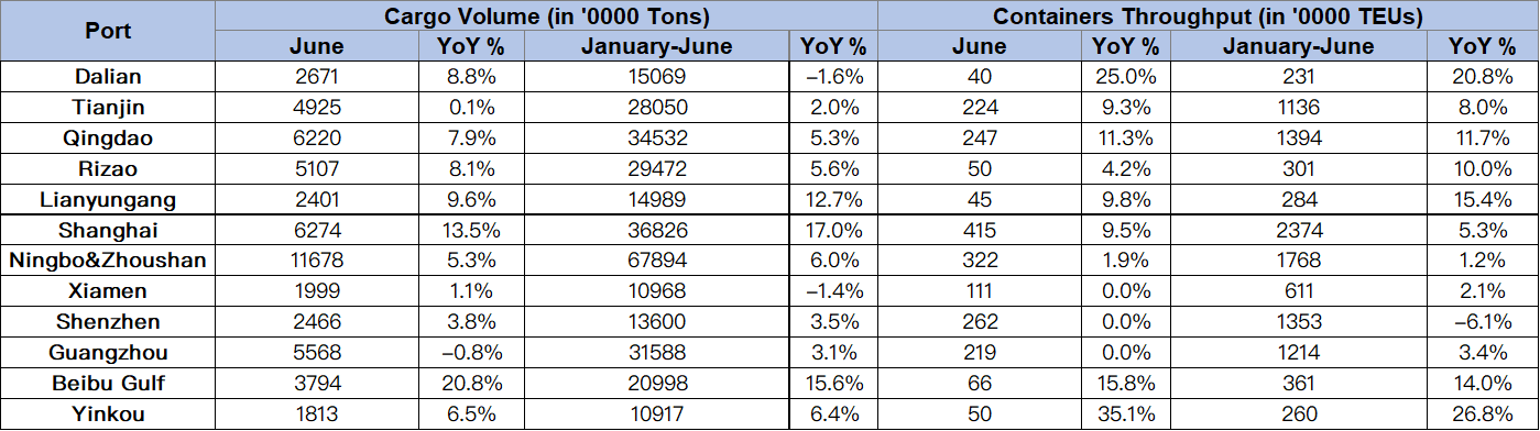 Cele mai mari creșteri procentuale au fost înregistrate în porturile Yinkou, Dalian și Lianyungang. Yinkou a raportat o creștere de 26,8% a volumului de containere de la an la an, Dalian a înregistrat o creștere de 20,8%, iar Lianyungang a înregistrat o creștere de 15,4% a volumelor de TEU.